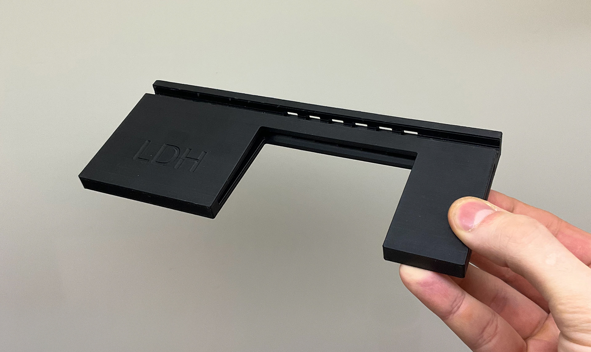 My dad needed a way to elevate his laptop without blocking the cooling fan, so I designed a stand with integrated airflow vents. A groove on the top mates with the laptop’s rubber grip to keep it from sliding during use.